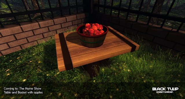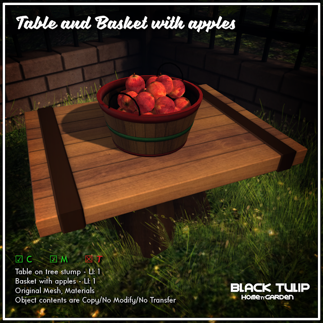 and then the accompanying table on a tree stump with a basket full of apples:
