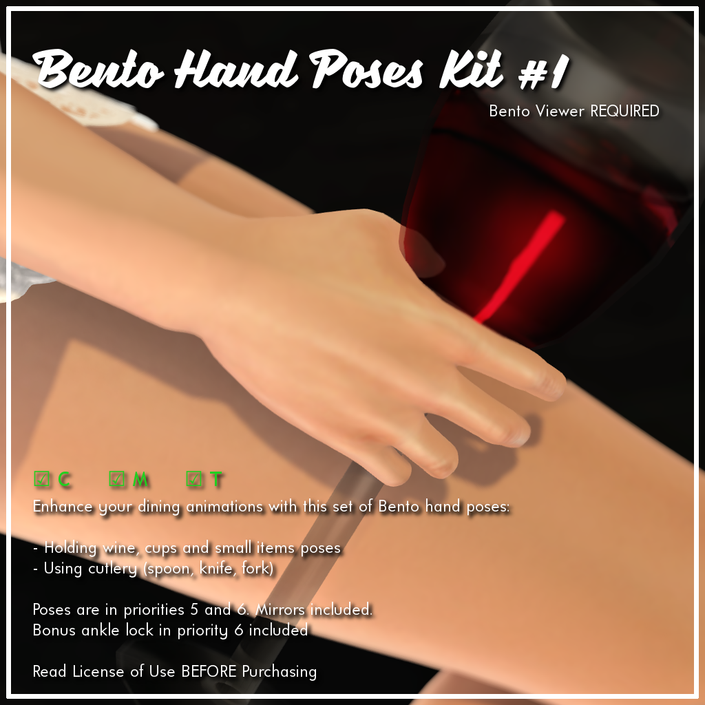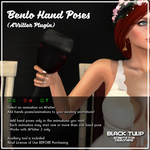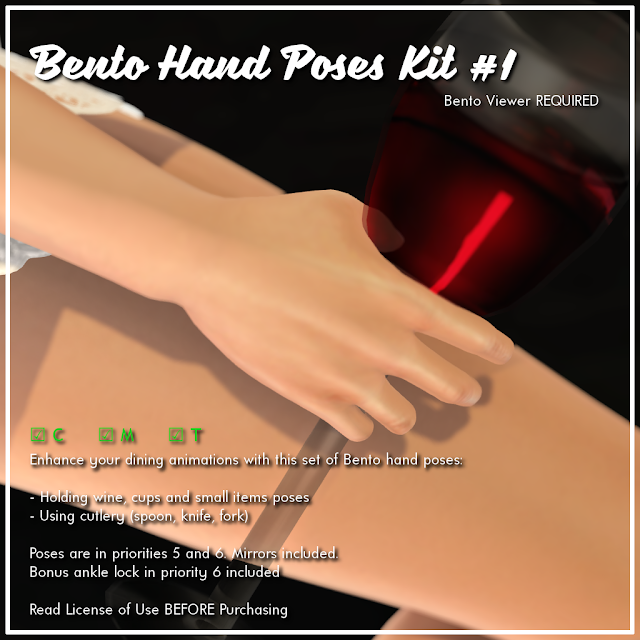 Bento's arrival to SL opened a whole world of possibilities to make our creations even more featured than before. Our new script is an addition to the family of AVsitter plugins that can play Bento hand poses together with older animations in AVsitter so your engines become more realistic and fun. The best of all is that you don't have to ditch your old animations because they don't have hand poses. All you need is adding Bento hand poses specifically designed, like our hand poses kit to enhance dining animations like holding a spoon, a wine glass, a knife and a fork, and more.