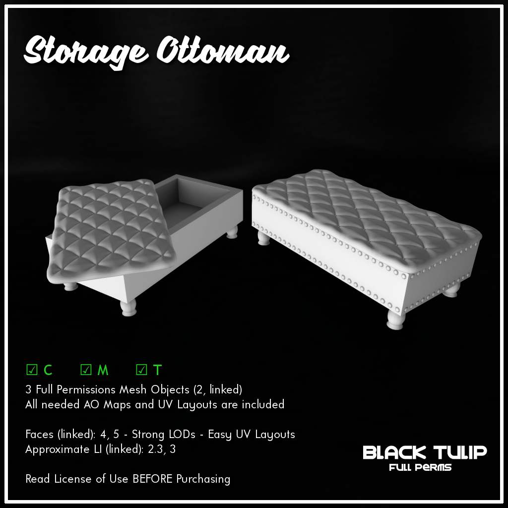 Designers that use full permissions objects have an ottoman with a mobile cushion part that makes it an storage bench. They can use