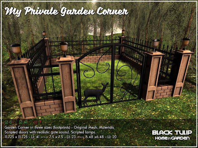 My private garden corner, with scripted doors, perfect for any kind of forest or other more urban location. It comes in three sizes to adapt to your LI resources, and you can also resize it, that won't affect the scripted doors: